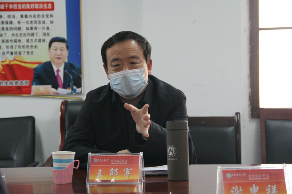 王邵军书记在调研过程中首先查看了学院党员活动室、相关办公场所,对疫情期间仍坚守在岗位上的各位同志表示亲切地问候。随后在调研会议上,他详细了解了学院疫情防控、学生工作、教学科研等方面情况,并提出了明确要求:一是要严格落实疫情防控关键时期各项措施,认真查找疫情防控可能存在的漏洞,确保疫情防控工作扎实到位。二是要扎实做好疫情防控期间学生心理疏导、困难帮扶,组织好网课教学,细致做好学生出国访学服务工作,千方百计促进毕业生就业工作质量水平。三是要高度重视高层次人才引进工作,切实提高教师教学科研能力水平,全力以赴做好迎接教育部第五轮学科评估各项准备工作,为扎实推进学校“双一流”建设作出积极贡献。(通讯员:李子云)