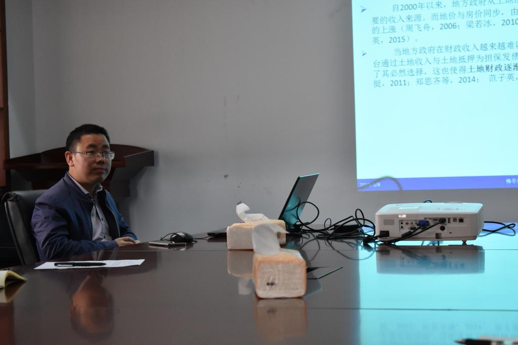 梅冬州教授首先提出了中国2014年以来宏观经济的三个反常现象:资本外流、经济下行背景下房价不降反升;对于有着稳定需求的一、二线城市的房地产市场,土地供应量近几年却在减少;民间固投大幅下滑而全社会固投基本稳定,表明目前投资主要靠房地产和基建投资支撑,投资结构恶化,资源配置效率下降。进而构建了一个带有金融摩擦的多部门小国开放DSGE模型,在模型中引入地方政府行为。通过数值模拟,本文从土地财政视角理清了外部冲击影响经济的传导路径和机制,解释了当前宏观经济三大反常现象的内在逻辑,本项研究对于理解当前的中国宏观政策困境、土地财政在经济波动中的作用以及未来改革方向的规划具有重要的意义。报告会后,梅冬州教授耐心解答了与会老师和学生提出的问题。