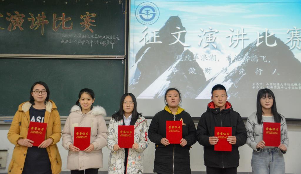 经过激烈的角逐,本次比赛落下帷幕。在“观改革浪潮,看经济腾飞,争做财税先行人”征文演讲比赛中获得一等奖的是2018级财政学三班黄琳,获得二等奖的是2018级税收学一班高晨、2018级税收学四班傅竞范,获得三等奖的是2018级税收学二班赵成龙、2018级税收学二班吴美静、2018级税收学三班张卓远。评委们为获奖选手进行颁奖并合影留念。