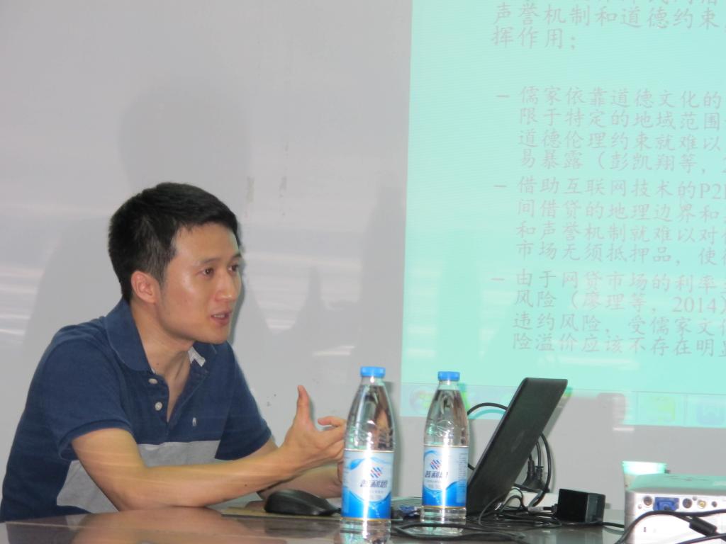张博士以2010-2015年“人人贷”平台的借贷交易为样本,使用各地市儒家祠庙和家谱数量衡量儒家文化影响强弱,检验P2P网络借贷行为是否受到以儒家为代表的传统文化的影响。通过实证研究认为,借款人所在地市的儒家文化可以显著提高其借款成功率和投资者对其申请借款标的的投资额,并缩短单位资金的借款时间,但是对于以违约率衡量的违约风险和以利率衡量的借款成本并没有显著的影响。其作用机制主要在于儒家文化可以传递借款人重视信用和诚信的信息,缓解借贷双方的信息不对称程度,这意味着文化在网贷市场中是有价值的信息资源,但并不是主要的违约风险约束机制。该工作论文研究视角独特,数据处理精细而科学,不仅丰富了儒家文化影响金融活动的系列研究,也为网贷市场中普遍存在的地域偏好提供了基于文化视角的解释。部分师生还针对其中的技术细节与张博士展开了学术讨论与互动,取得了很好的研讨效果。