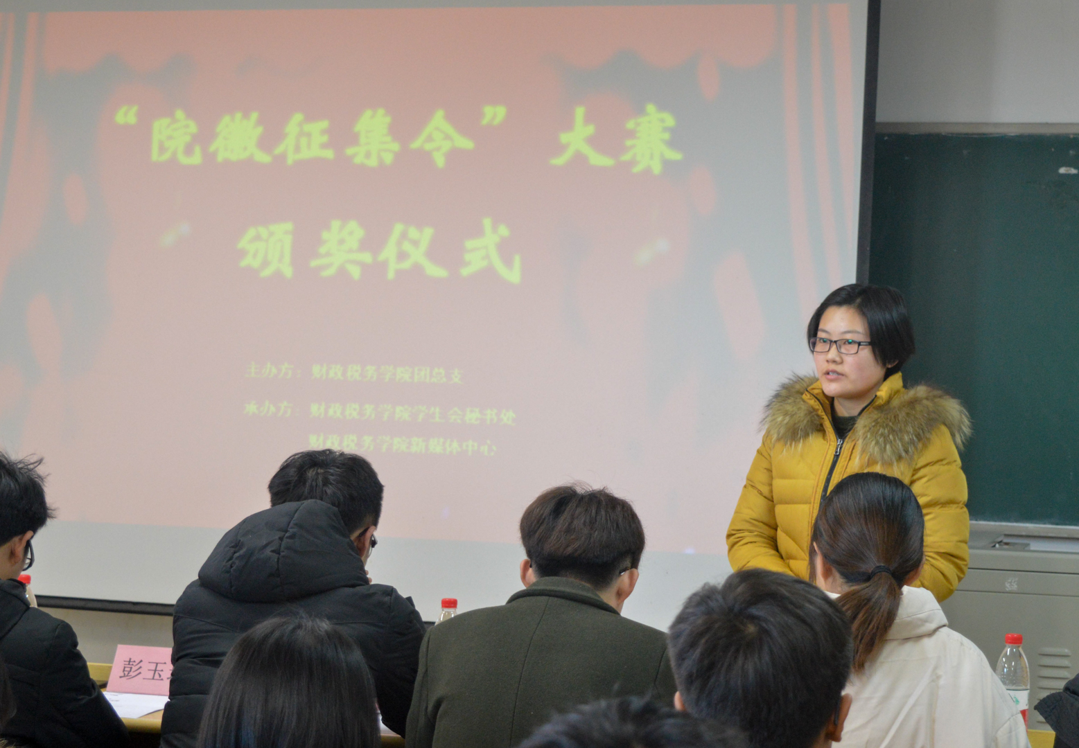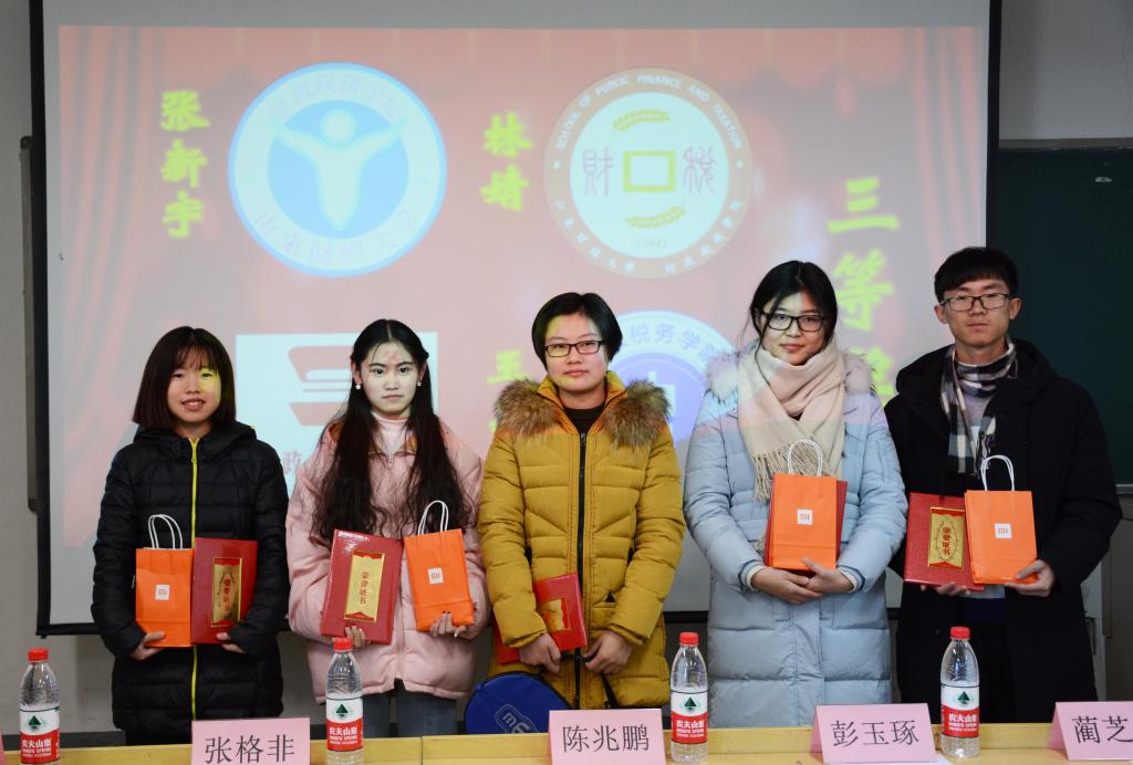 会议伊始,学生会秘书长陈兆鹏宣读获奖人员名单。2016级税收学二班张婷获得一等奖;2016级财政学五班王易文、2017级税收学二班窦思维获得二等奖;2016级税收学四班林婧、2016级财政学五班王易文、2017级财政学一班张新宇、2017级税收学二班窦思维获得三等奖。仪式现场由学生会主席团各常委为全体获奖同学颁发证书。
