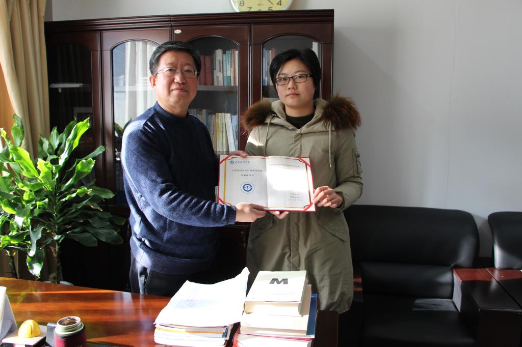 院长岳军在舜耕校区为一等奖获得者张婷颁发《院徽征用书》,并向张婷同学表示祝贺。他认为学院的发展离不开文化建设,学院文化建设是学院综合实力的体现,良好的文化建设有利于提高学生的人文道德素质,提升学院的文化品位。