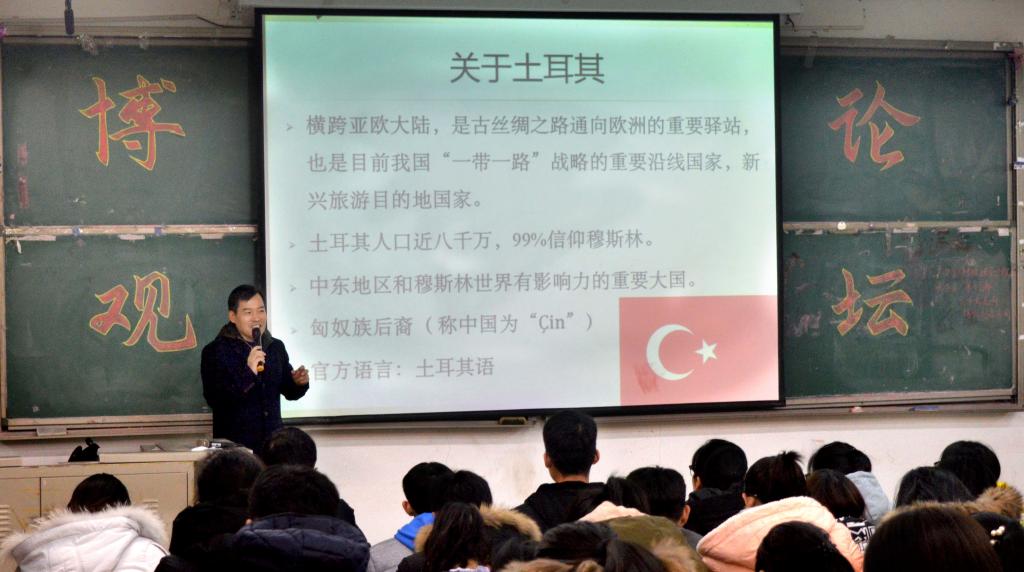刘召明教授作为国家公派教师,曾在土耳其埃尔吉耶斯大学教授汉语言文学达四年之久。他以“出塞”、“游园”、“惊梦”、“夜奔”八个字概括并分享了自己在土耳其教学生活的经历与感悟。他以幽默的语言,生动的幻灯片,有趣的经历吸引了同学们。