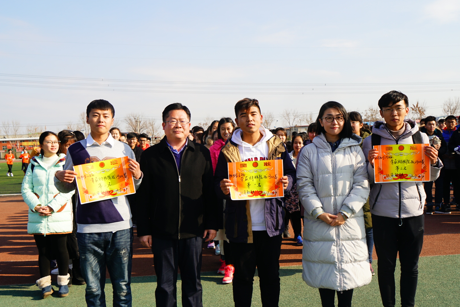 阵阵欢呼声中,我们迎来了本次比赛的颁奖仪式。税收学五班、税收学一班、财政学四班分别荣获冠、亚、季军,郭滨滨老师与李建永老师为获奖班级颁发奖状并表示祝贺,同时对其他参赛班级的拼搏精神表示赞赏。最后,老师与获奖班级合影留念,本次比赛圆满结束。