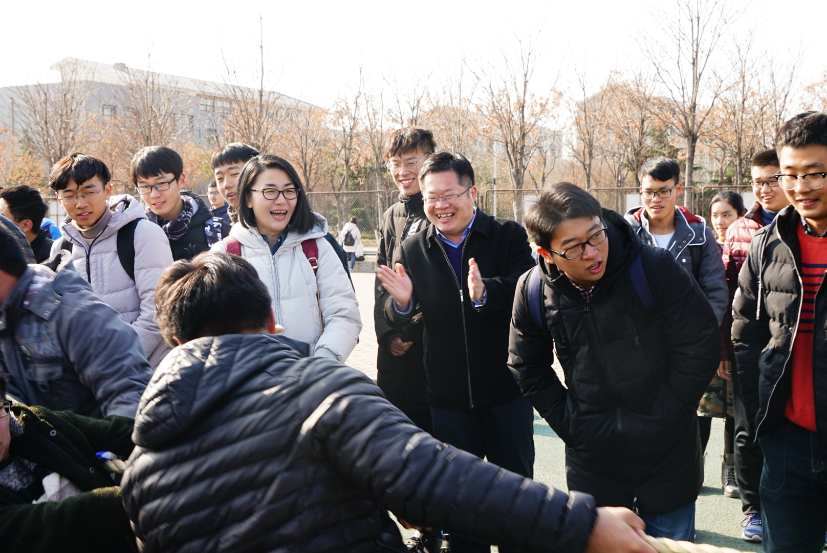 比赛首先进行预赛。冽冽寒风吹不灭同学们的满腔热情,呐喊助威声此起彼伏。振奋人心的呼喊回荡在操场上空,瞬间点燃了财税学子的激情。参赛队员们斗志满满,一双双手紧握麻绳。经过激烈的比拼,税收学一班顺利拿到半决赛的第一张入场券,紧随其后进入半决赛的分别是税收学五班、财政学四班和财政学一班。