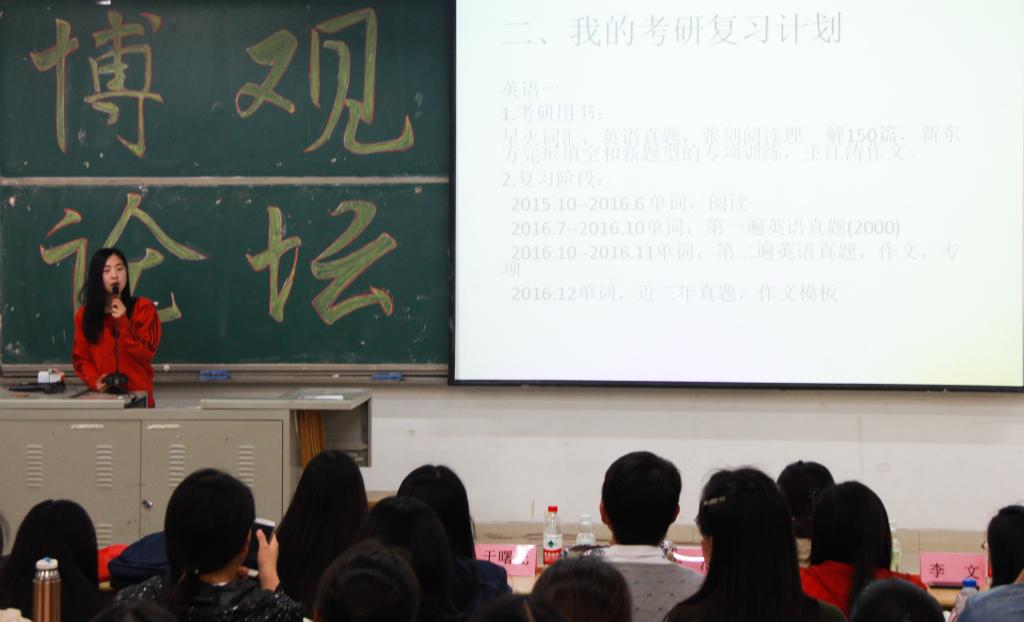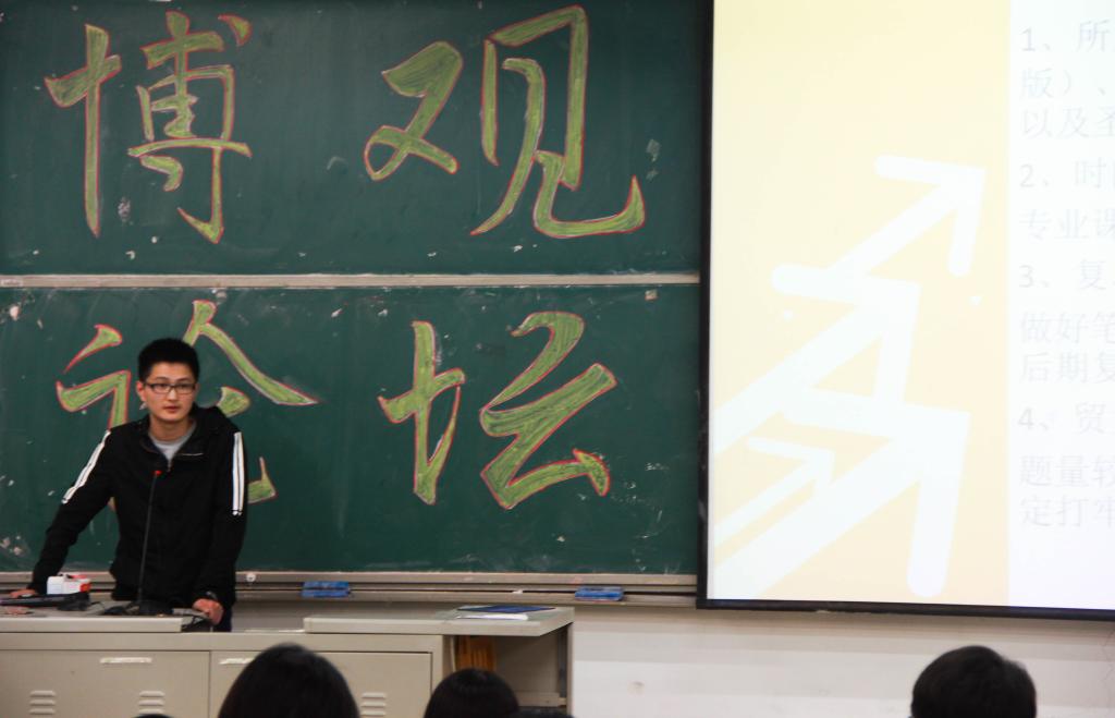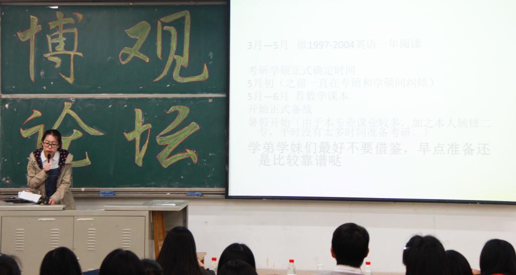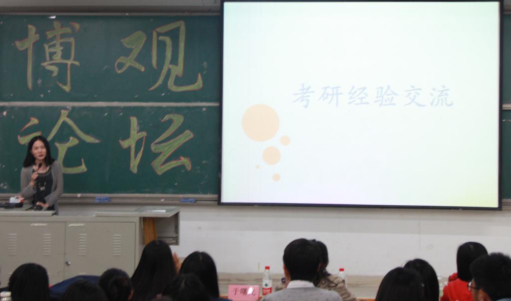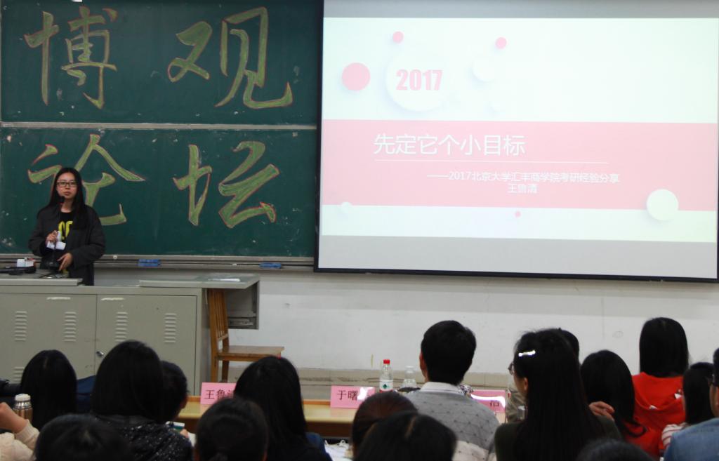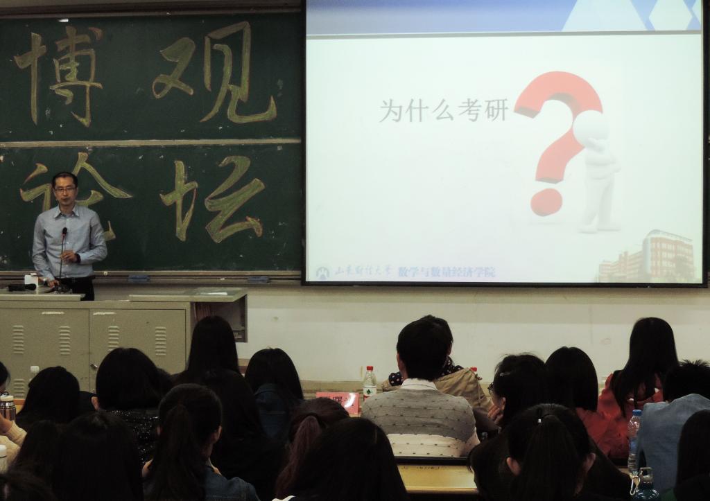 主办,学生会创新实践中心学术竞赛部、策划部、博观创客空间联合承办。本次分享会由数学与数量经济学院副教授宋浩主持,由2017年研究生入学考试中取得优异成绩的王思琪、王潇、王鲁清、李文、李光臣向同学们分享考研经验。2015、2016级部分同学聆听了此次经验分享会。