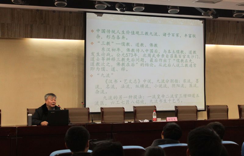 孙玉太教授首先通过“梁漱溟父亲之问”,引出讲座的主题——中国传统人生价值观。随后,对儒、道、佛三家为代表的中国传统人生价值学说进行了简要说明:“中国古代,三教九流、诸子百家均有不同的理解,各有不同的看法,形成了丰富多彩的人生价值观念流派体系。但是,从对中国人人生价值观形成和发展影响既深且广方面考察,则没有超过儒、道、佛三家的。”“儒、道、佛三家鼎足三立,相反相成,融通互补,为中国传统人生价值学说的形成,提供了极为丰富的思想资源。”“以佛修心、以道养身、以儒治世,是传统中国知识分子的修行处世之道。”