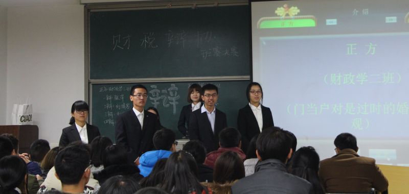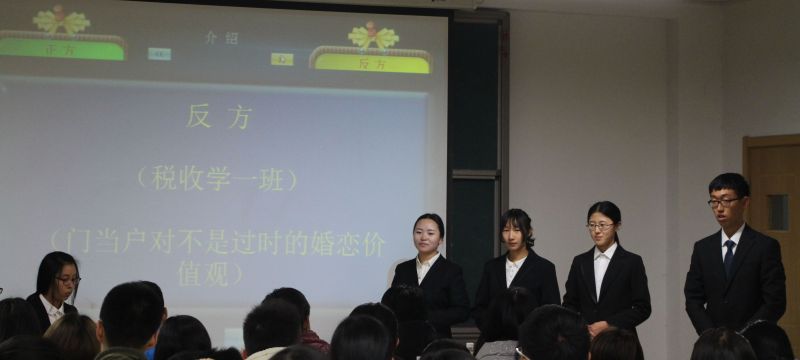 本次班级辩论赛决赛的辩题是“门当户对是不是过时的婚恋价值观”。正方财政学二班辩论队的观点为门当户对是过时的婚恋价值观,反方税收学一班辩论队的观点为不是过时的婚恋价值观。