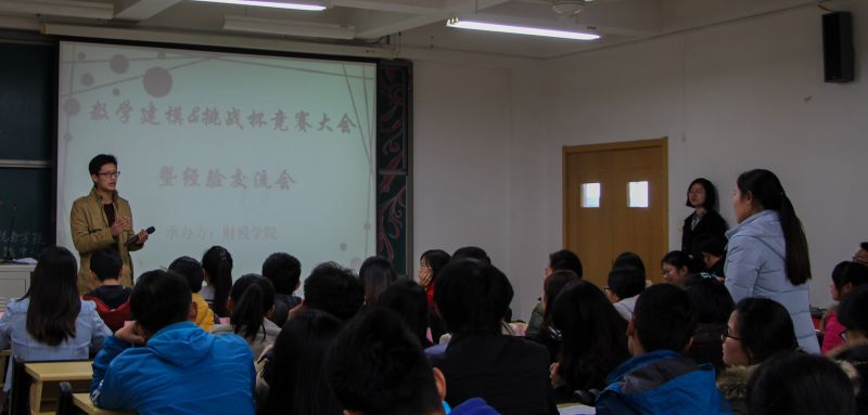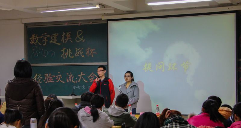 最后,数学建模大赛国家一等奖得主柴杉、江煜与我们交流了参加数学建模大赛的经验与体会。二人就大赛的准备与训练、软件和算法的运用以及材料的收集与整理方面做进一步介绍。他们强调,参加数学建模大赛无论对个人能力提高还是对日后学术研究和日常工作都有很多好处。它不仅锻炼我们的快速思维能力及归纳总结能力,而且在参赛过程中,我们接触到的形形色色的知识,也将开拓我们的眼界,丰富我们的阅历。在答疑环节,现场学生踊跃提问,二位一等奖得主细心讲解,渲染了大会的学术氛围。他们期望参赛同学能团结合作,勇于尝试,提高效率。