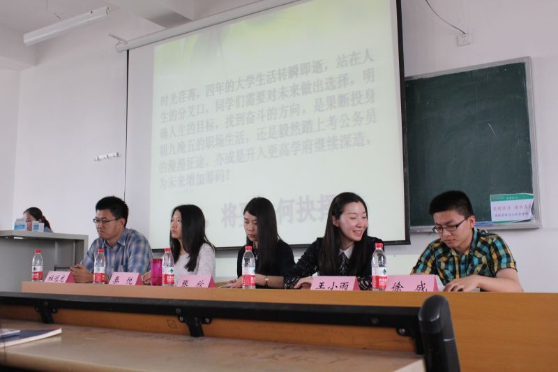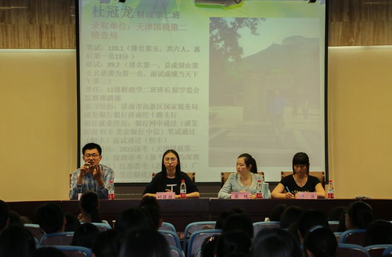 团委主办,财税学院学生会学习部承办。本次经验交流会的主讲人是在2014年国家公务员考试中取得优异成绩的2011级学生杜冠龙、王小雨、徐成、刘筱荷、梁悦和在2014年研究生入学考试中取得优异成绩的2011级学生秦悦、张欣、许展。财税学院两个校区的学生参加了本次经验交流会。
