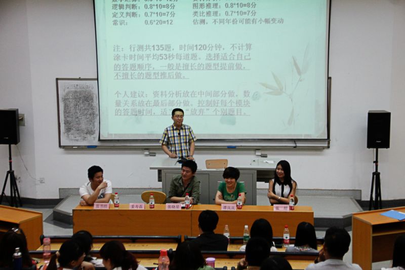 学工办主任兼团总支书记王正一老师。经验交流会的主讲人是在2013年研究生、国家公务员中考试中取得优异成绩的2010级学生谭岚岚、张超、姜寿磊、张晓星、张书经。本次交流会由财税学院团总支主办,院学生会学习部承办。山财大部分学生聆听了交流会。