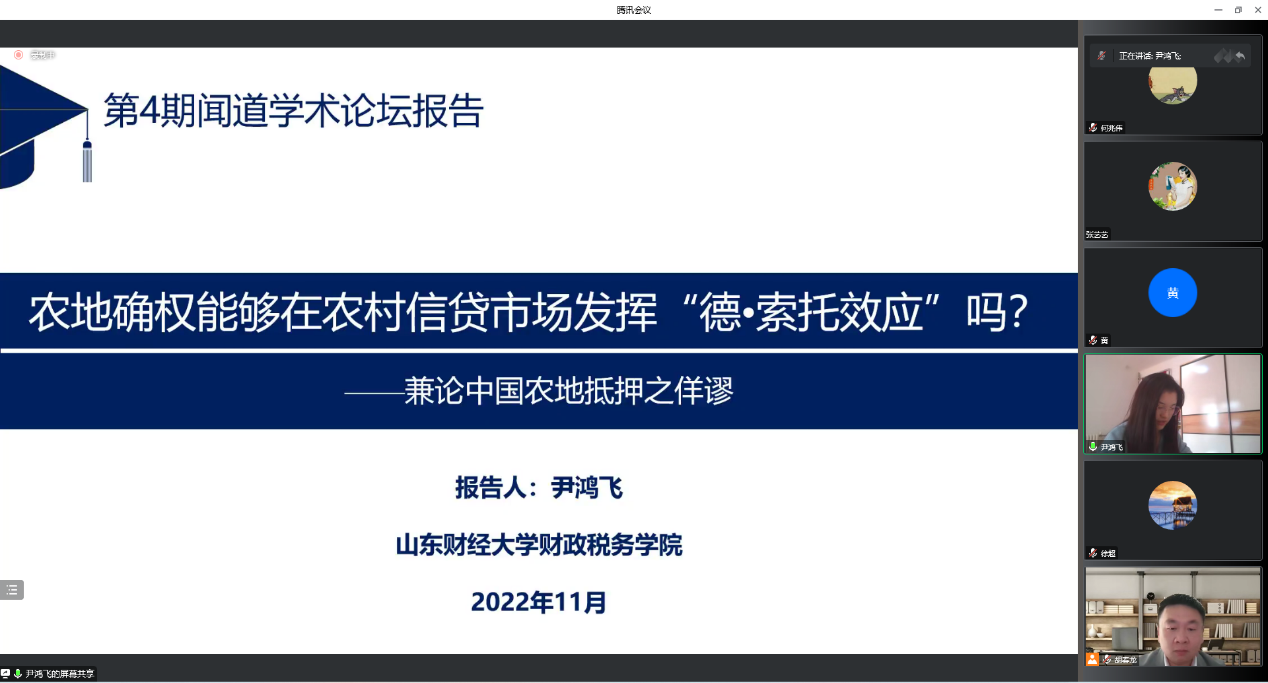 2022年第4期闻道学术论坛以线上方式举行。本期论坛由青年博士尹鸿飞做了题为《农地确权能够在农村信贷市场发挥“德•索托效应”吗?——兼论中国农地抵押之佯谬》的学术报告,研讨会由青年博士胡春龙主持,海角社区app