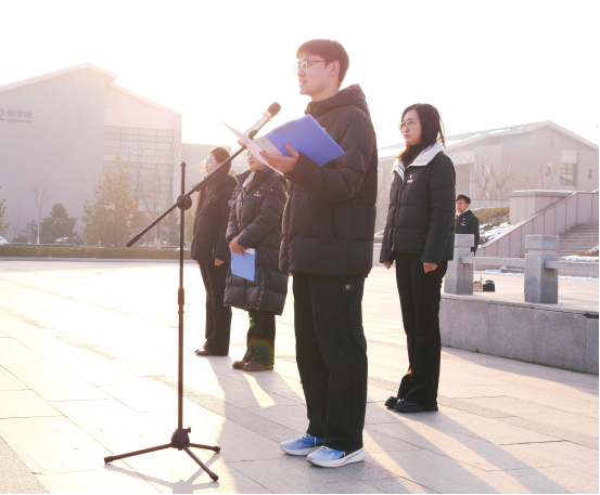 迎着清晨的阳光,国旗护卫队迈着整齐的步伐护送国旗入场。随着国歌奏响,五星红旗在轻风中缓缓升起。全体师生肃立,伴随着旋律齐声高唱国歌,向徐徐升起的旗帜行以崇高的注目礼。