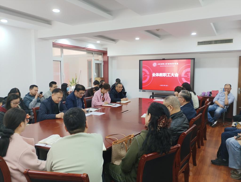 在舜耕校区办公楼816召开全体教职工大会。学院领导班子出席会议,全体教职工参加会议。会议由学院党委书记石伟主持。