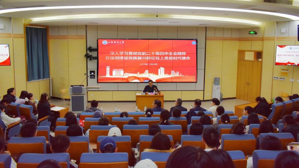 11月24日下午,学院召开学习贯彻党的二十届四中全会精神宣讲报告会。学校宣讲团成员、副校长王敬政以《深入学习贯彻党的二十届四中全会精神 在强国建设民族复兴新征程上勇担时代使命》为题做宣讲报告。学院党委书记石伟主持,班子成员、师生代表等二百余人参加。
