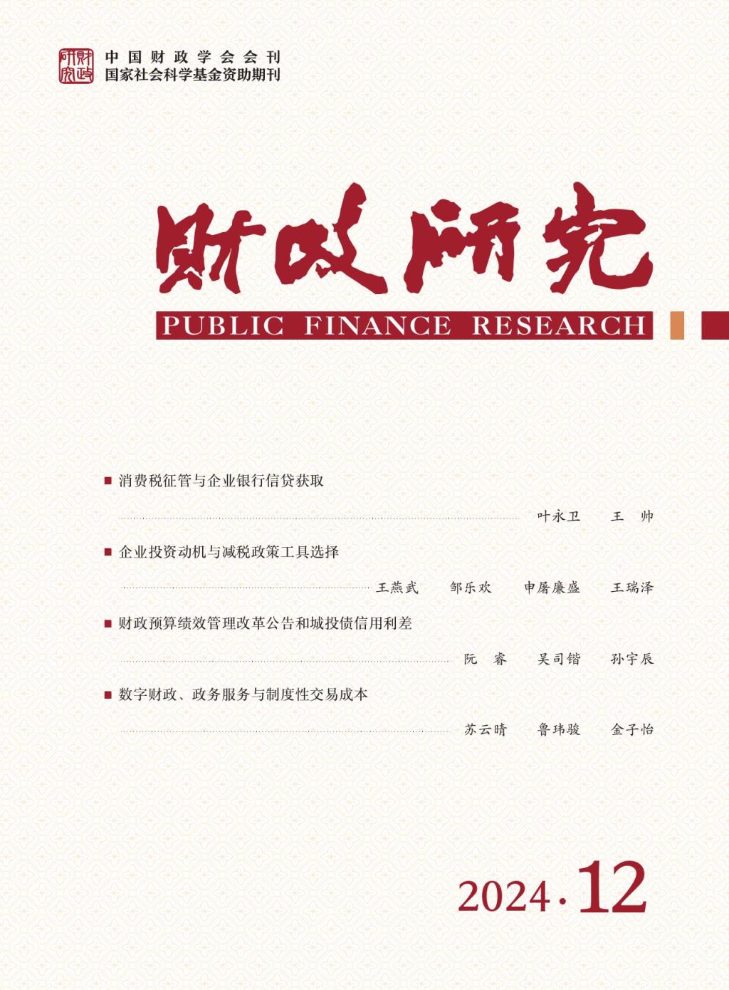 青年教师苏云晴作为第一作者撰写的论文《数字财政、政务服务与制度性交易成本》在《财政研究》2024年第12期作为封面文章发表。该期刊属于海角社区app