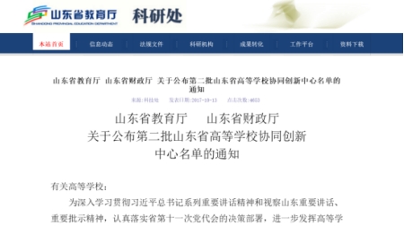 2017年10月13日,山东省教育厅、山东省财政厅联合公布第二批山东省高等学校协同创新中心名单,“山东省新旧动能转换与政府财力配置协同创新中心”成功入选培育建设的第二批山东省高等学校协同创新中心名单,其依托单位之一为“淮海财金研究院”主办单位济宁市人民政府。