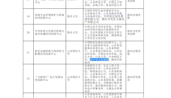 为牵头单位,以中国财政发展协同创新中心、山东省政府研究室、武汉大学、中央财经大学、济宁市人民政府等政府机构、高校为协同单位,面向区域发展为研究方向的联合体。中心立足经济新常态下的山东省情,以新旧动能转换与政府财力配置中的重大问题为导向,围绕财政理论研究与社会实践如何贯彻落实习近平总书记系列重要讲话精神和对山东工作的重要指示批示以及李克强总理近期考察山东重要指示,紧密结合新旧动能转换工程,来实现山东“大象经济”的顺利转型升级。