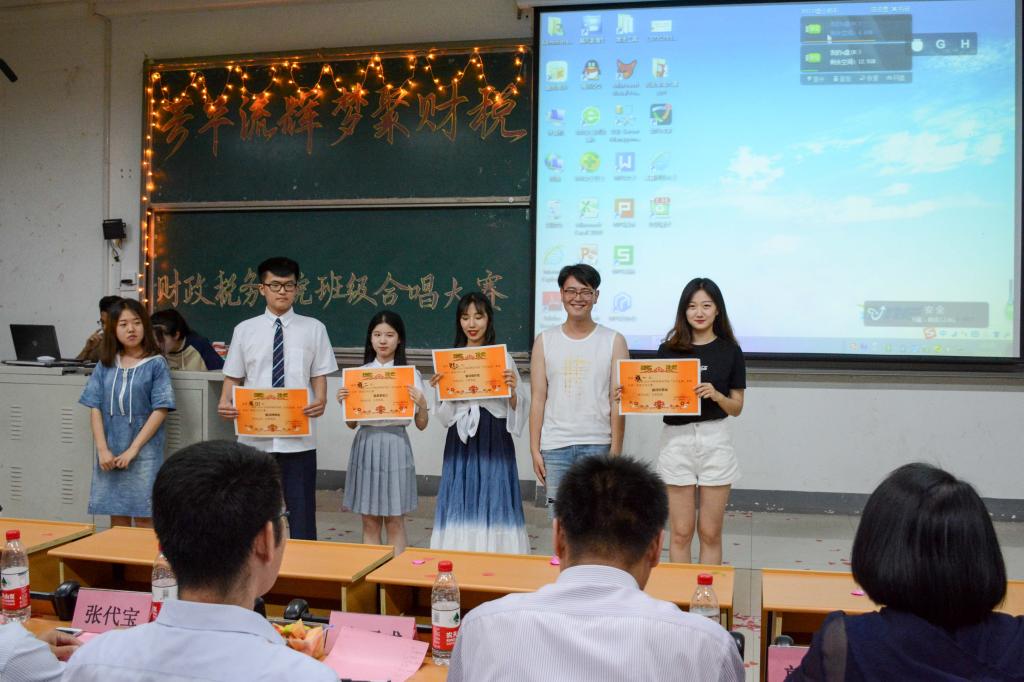 本次班级合唱大赛,财政学一班荣获一等奖,财政学五班、财政学二班获得二等奖,税收学五班、财政学四班、税收学三班获得三等奖,税收学二班、税收学一班、财政学三班、税收学四班分别获得最具表现力奖、最佳创意奖、最佳组织奖、最佳精神奖。财政学一班王宇轩同学获得最佳指挥奖。