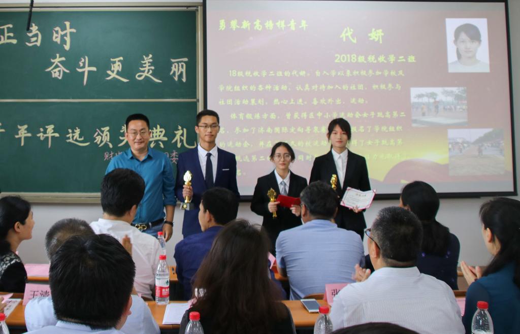 2018级财政学五班刘兴汉、2018级财政学一班钟丽薇、2018级税收学二班代妍获得了“永攀新高榜样青年”奖项。他们在今年的学校春季运动会上驰骋赛场,超越极限,为学院的荣誉而战,用拼搏的决心铸造荣誉的高台。