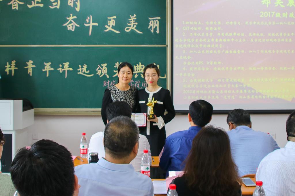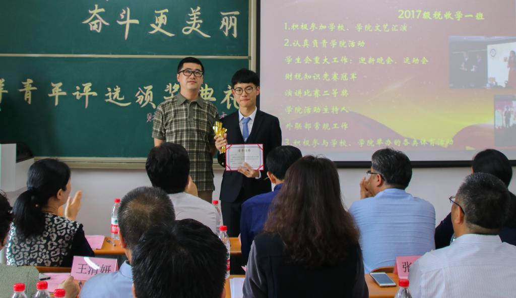 接下来颁发的是“校园文化榜样青年”奖项,由来自2017级税收学一班的刘丰华获得。他积极组织并参与了各项校园文化活动,在文体生活中起到了良好的模范带头作用,在丰富同学们课余生活的同时也逐渐提高着自己。