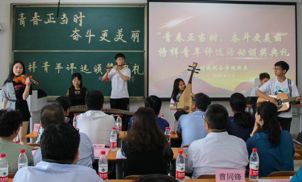 中场休息期间,学院艺术团为大家带来了器乐合奏《卡路里》和歌曲《梦想天空分外蓝》。表演体现出财税学子的青春朝气与蓬勃风采,为同学们带来了一场视听盛宴。