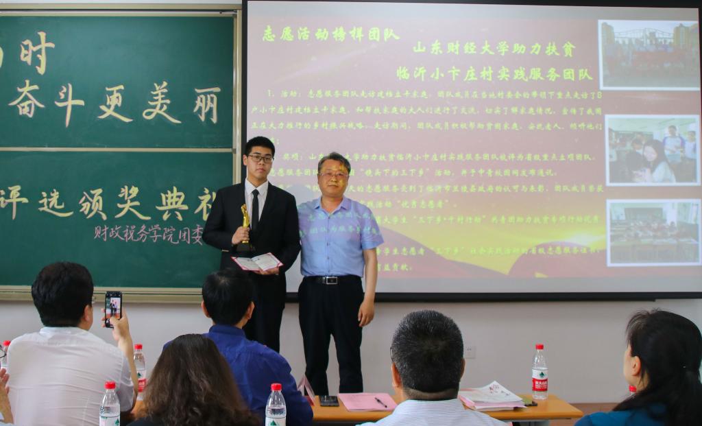 接下来,由各位老师为获得提名奖的同学们颁奖。上台领奖的同学有“励志笃行榜样青年”提名奖获得者2016级财政学一班莫益亮,“敬业敏学榜样青年”提名奖获得者2018级财政学四班谢源一琦,“特优模范榜样宿舍”提名奖得者为圣井校区33322宿舍,“博闻强识榜样青年”提名奖获得者2017级财政学五班张文善,“社会实践榜样青年”提名奖获得者2012级财政学三班李丽云,“校园文化榜样青年”提名奖获得者2017级财政学三班陈晓钰,“志愿服务榜样团队”提名奖获得者鲁能志愿者服务团队,“宣传活动榜样青年”提名奖获得者2017级财政学一班曹元荷。