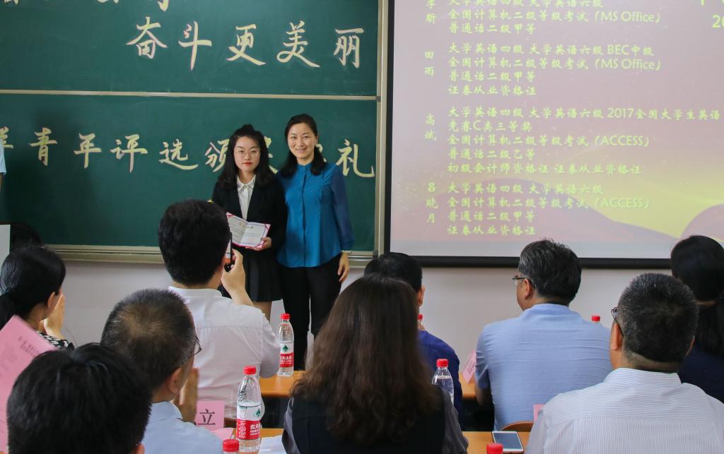 首先颁发的是“励志笃行榜样青年”奖,2016级税收学六班的姜令臻获得了此奖项。通过简短的个人视频,她向同学们介绍了自己的个人经历、曾获得的奖项荣誉,分享了个人学习经验,她建议同学们构建思维导图,能够学以致用,以从容的心态面对考试与竞赛。