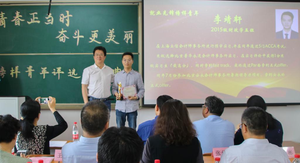 最后一个颁发的奖项是“就业先锋榜样青年”,2015级财政学五班的李靖轩获得了该奖项。他在台上与同学们分享了有关就业的宝贵经验,使同学们对四大会计事务所有了进一步的了解。他建议同学们要相信自己,敢于尝试,希望同学们能在以后的就业中找到自己满意的位置。