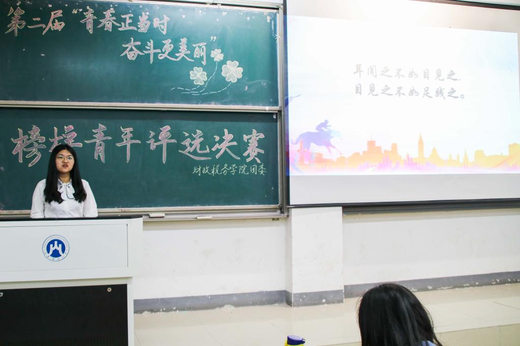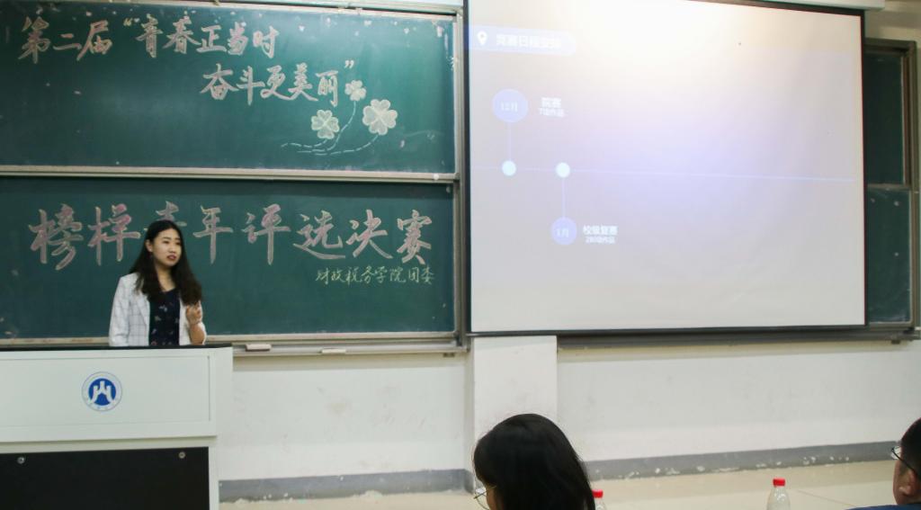 第四个上场的是博闻强识榜样青年候选人2016级税收学六班王雪萍和2017级财政学五班张文善。在认真学习校内课程的同时,他们广泛学习课外知识,并取得突出成绩。不仅如此,候选人们还广泛参加各类知识竞赛开拓自己的视野,掌握各类计算机软件应用来增强自身能力。他们认为在课余时间学习课外知识有利于自己增长见识,扩大知识面,对日后继续深造或是参加工作以后都具有重要意义。