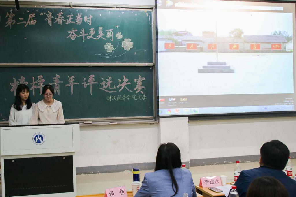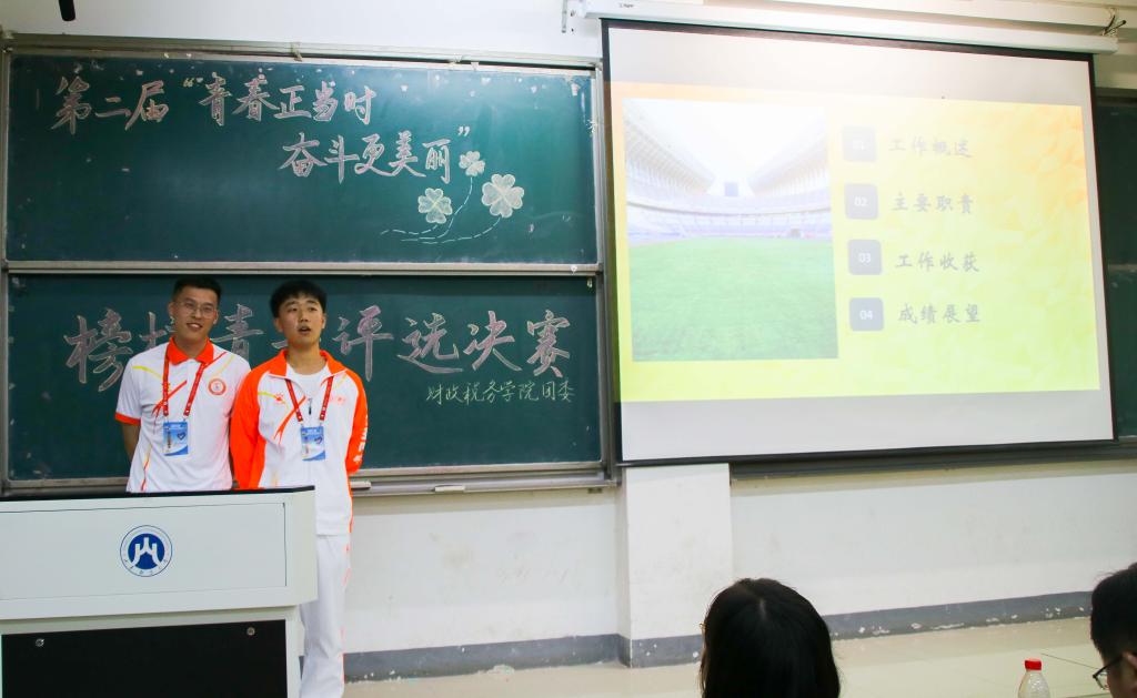 接下来上场的是敬业敏学榜样青年候选人2017级税收学一班吴昌泰和2018级财政学四班谢源一琦。候选人首先向观众们介绍了在学生会的任职情况,展示了在工作中取得的成果。作为学生会中的重要成员,他们在尽职尽责完成工作的同时,并没有放松对自己学习的要求,能够做到合理安排时间,兼顾学习生活与部门工作,赢得了老师们与同学们的一致好评。