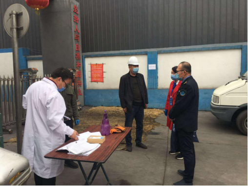 2018级刘子怡父亲配合医护人员对过往车辆人员进行体温检测及登记