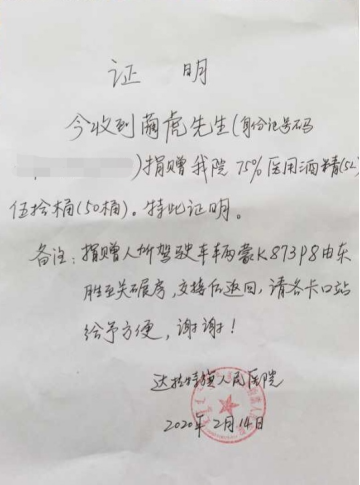 2019级赵静雯家长为医院义务捐赠50桶消毒液