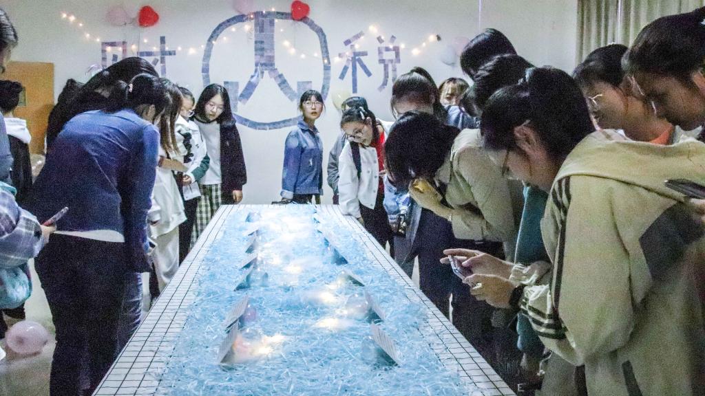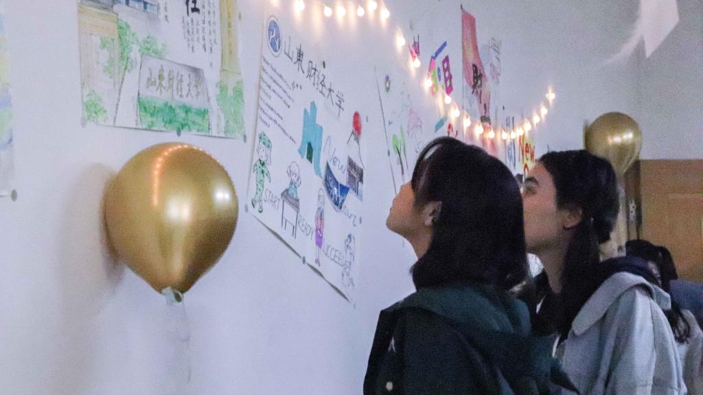 飘扬的彩带、五颜六色的气球和温馨的彩灯装饰着班级展馆。班级展馆中不仅张贴着各班制作的以“new start”为主题的班级画报,还有各班带班们对2020级新生的寄语卡片。各个班的画报虽然风格迥异,但相同的是新生们对于大学新生活的好奇与期许。寄语卡片整齐地排列在书桌上,字里行间流露着带班们对于新生的不舍和期望。同时还有由便利贴装饰起来的留言墙,为新生们提供了表达自己的平台。