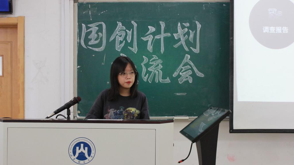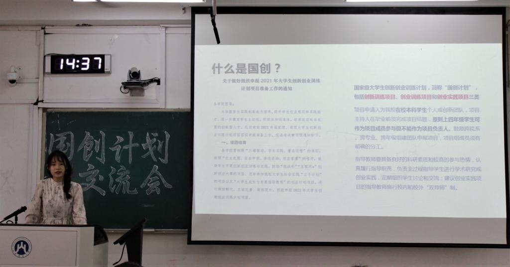 会议伊始,由伊雪瑶向在场同学介绍“国创计划”的当下概况:“国创计划”的参赛门槛与专业性要求相较于其他二类项目偏低,对于初次接触创赛的同学,参加国创是一种用来了解、体验此类项目的较好途径。随后,伊雪瑶同学分享了自己在撰写报告时的小技巧:撰写报告前,一定要确定好研究类型和研究方向,并为之做好充分的材料准备;撰写报告时,需着重描写项目概况、具体内容、项目优势三个方面,必要时可添加一些项目预算和指导老师意见;撰写完成后,回顾一番,此时可以将一些文字内容更换为数据或图表,使报告内容简洁易懂。