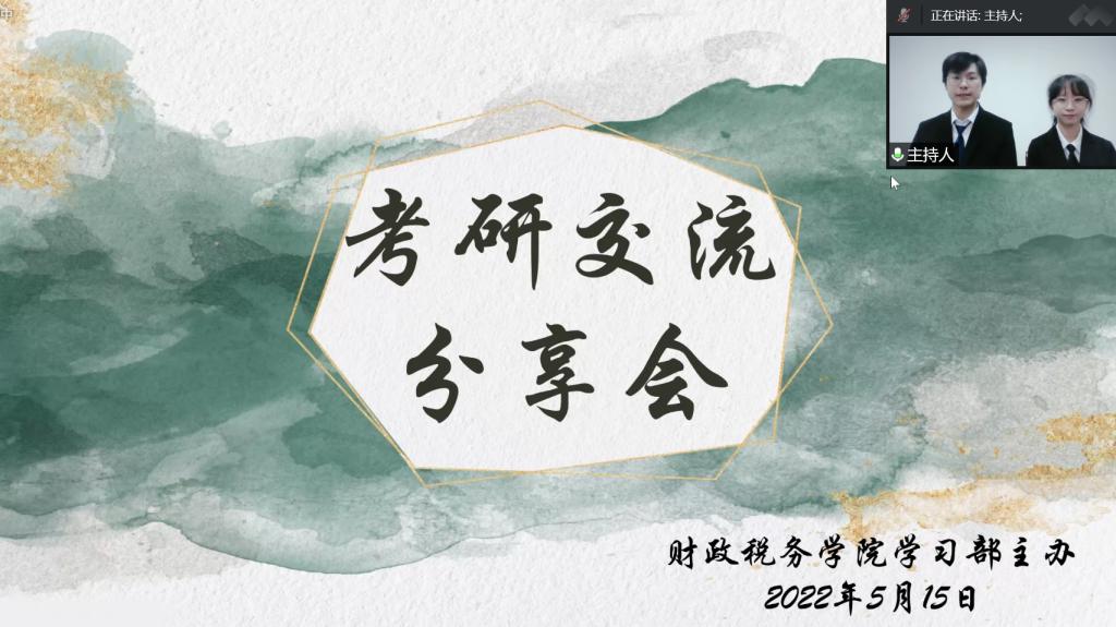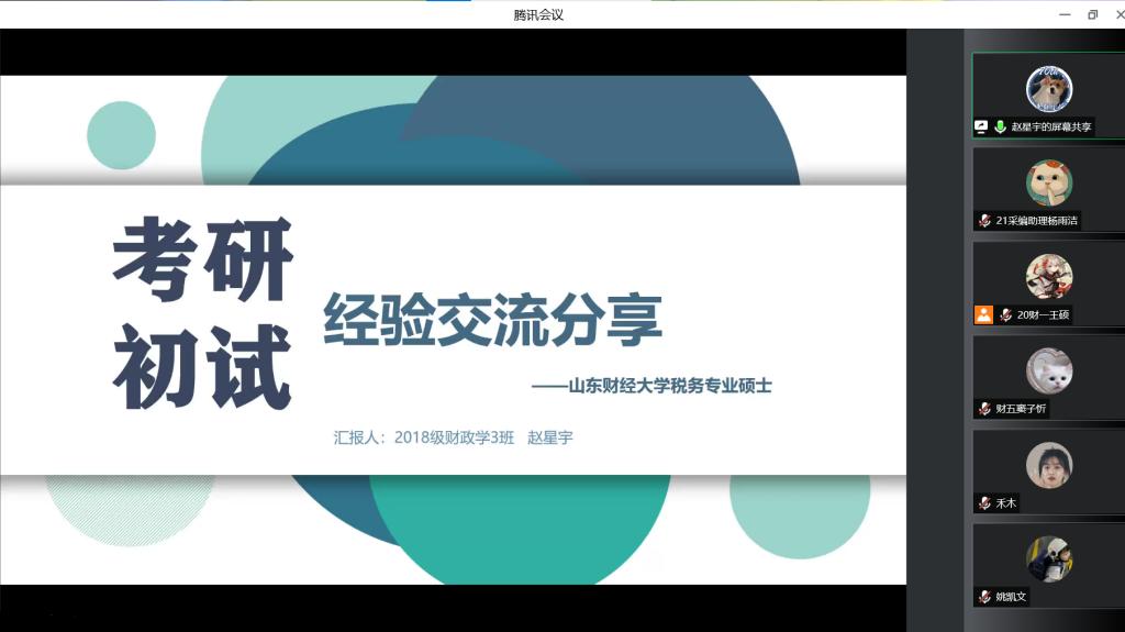 税务专硕的赵星宇同学,他从“学习计划”和“初试科目学习”两方面分享了他的考研经验。他建议大家兼顾考研初试科目和主修课程的学习,同时为同学们分析了初试科目的考试题型,并为同学们分享了一些参考书目和网络课程。考取中国人民大学税务专硕的李晓盼同学介绍了选择院校时获取信息的途径,比如通过院校官网、公众号、微博等,并向同学们分享了她的各科学习计划和具体时间线。她指出:“努力终有回报,希望大家调整心态,积极应对备考中出现的问题,祝大家一战成硕。”考取中南财经政法大学税务专硕的赵楚扬同学,她从就业、个人喜好、师资力量等方面向同学们介绍了如何择校,同时她结合自身经历为同学们分析了专业课的学习内容和考察流程。此外,她还向同学们强调了保持积极乐观心态的重要性,希望同学们能平静而有力量地走过考研这一段旅途。考取对外经贸大学税务专硕的张欣然同学结合自身向同学们分享了她快速择校的方法,她在分享自己的考研经验时,重点向同学们强调了要注意进行396经济类联考这门课程的模拟考试,切实感受考试过程中的时间分配。她还向同学们分享了学习税法时采用的思维导图,帮助同学们提高备考效率。推免至山东大学财政学学硕的赵心玮同学分享了她的保研经验。她向同学们介绍了关于推免的各个阶段、推免的前期准备工作和九月份的预推免流程,同时她提醒同学们要利用好网络信息资源,多问多咨询。考取中央财经大学财政学学硕的宓科廷同学从考研情况和备考过程两方面分享了他的经验。他为同学们分析了中央财经大学的招生专业、考试特点等。接着,他分享了他的复习过程、所选资料和课程,为同学们提供了宝贵的借鉴经验。