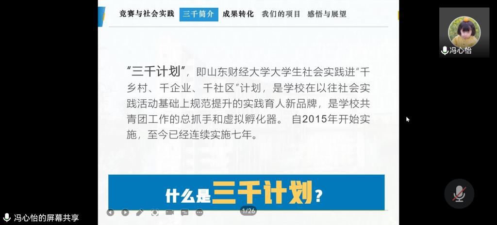 创新实践中心承办。会议以线上形式进行,旨在让同学们对“三千计划”有更好的认识和了解,对竞赛有更充足的准备。本次会议由2020级税收学一班王思峣、2020级税收学一班张康源、2020级财政学类三班冯心怡主讲,2021级部分同学参加。