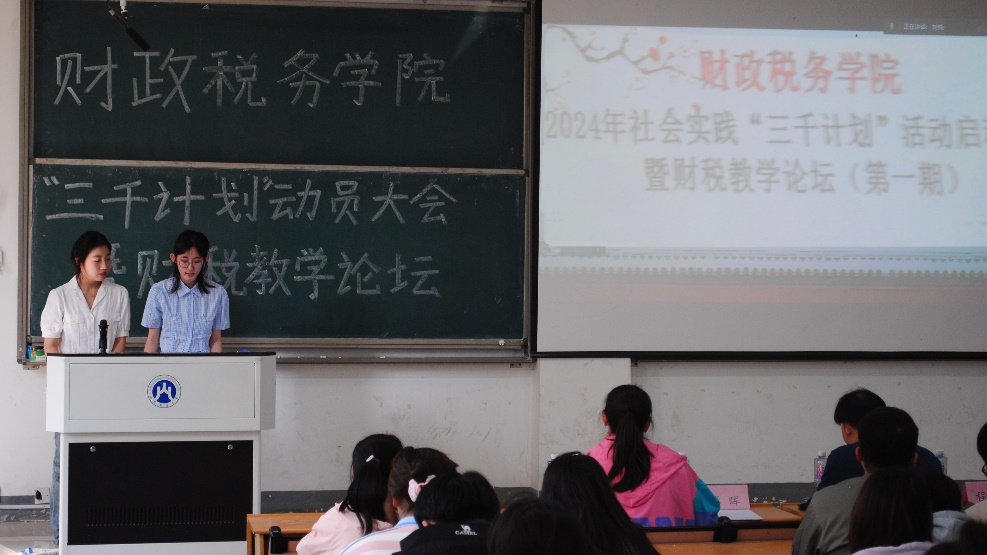 2024年社会实践“三千计划”活动启动仪式暨财税教学论坛(第一期)于圣井校区敏行楼圆满举行。学院党委副书记滕晖,副院长赵宝廷,辅导员李峻汝、程佳受邀出席,2023年“三千计划”优秀队长代表受邀分享,22、23级学生代表参加此次活动。