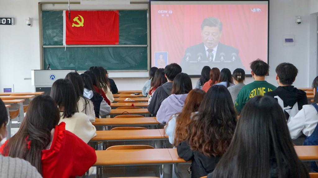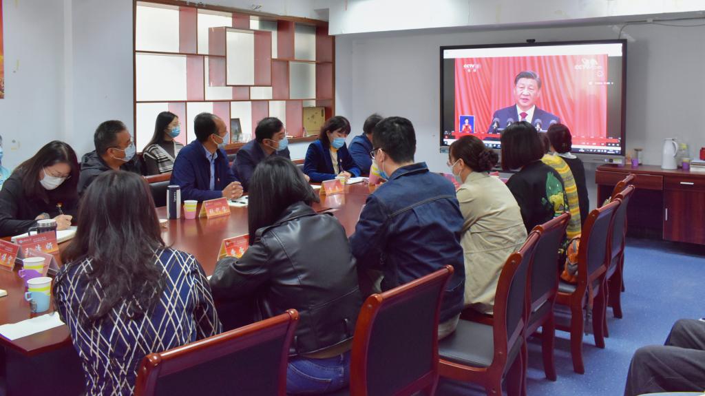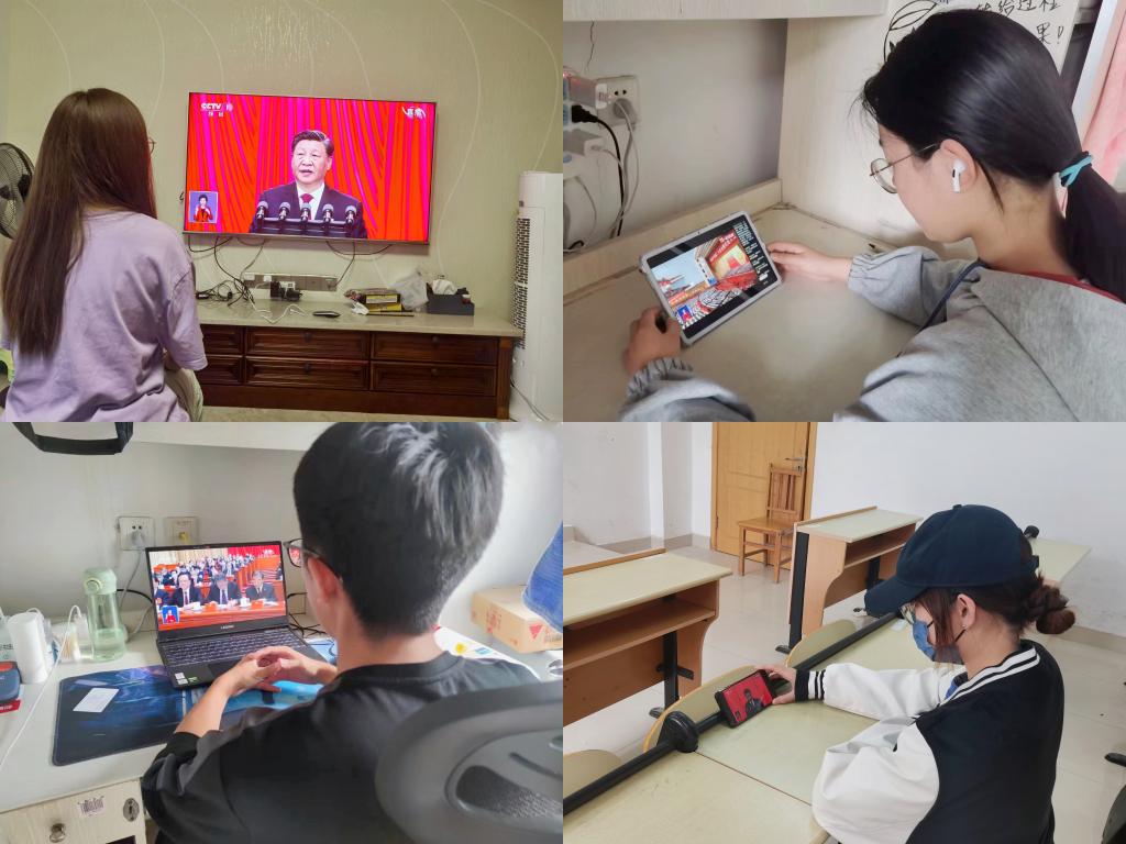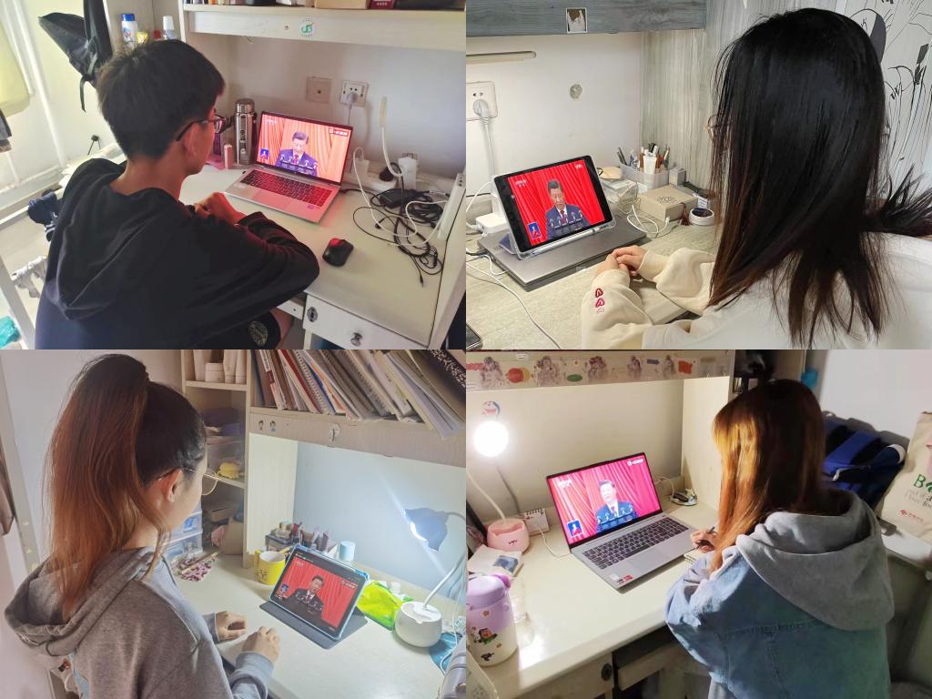 党委书记刘波,院长李森,党委副书记张代宝、滕晖,副院长郭健、赵宝廷,全体党支部书记,教师党员代表和学生党员代表分别在舜耕校区816会议室和圣井校区7322教室集中收听收看开幕会盛况。