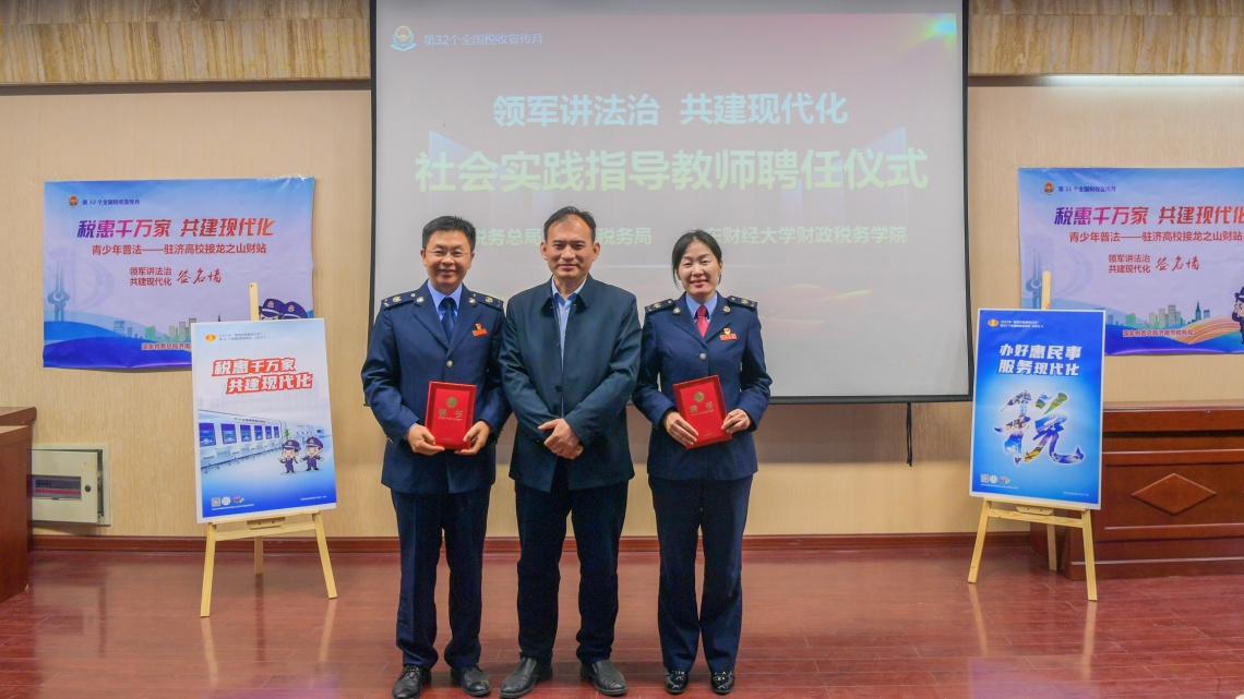 正式聘请全国税务领军人才王国强和王超慧为社会实践指导教师,赵宝廷为两位导师颁发聘书。