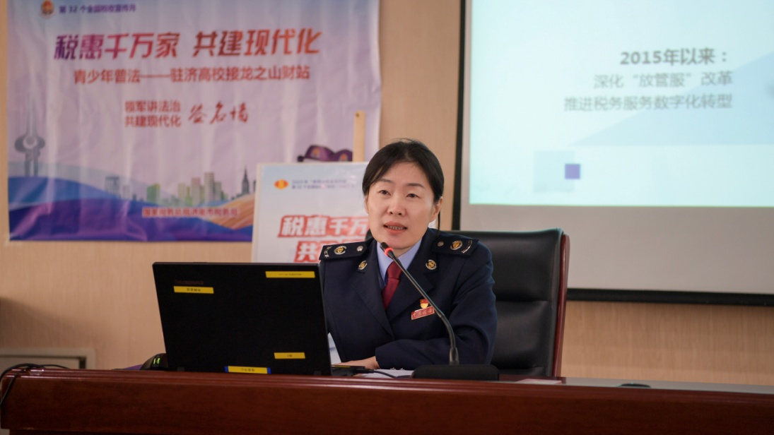 4月13日上午,国家税务总局济南市历下区税务局副局长刘利群等一行8人在圣井校区敏行楼5106报告厅与海角社区app